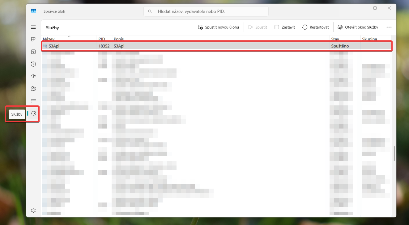 • Ve správci úloh vyberte ikonu služby a najdete službu S3Api.