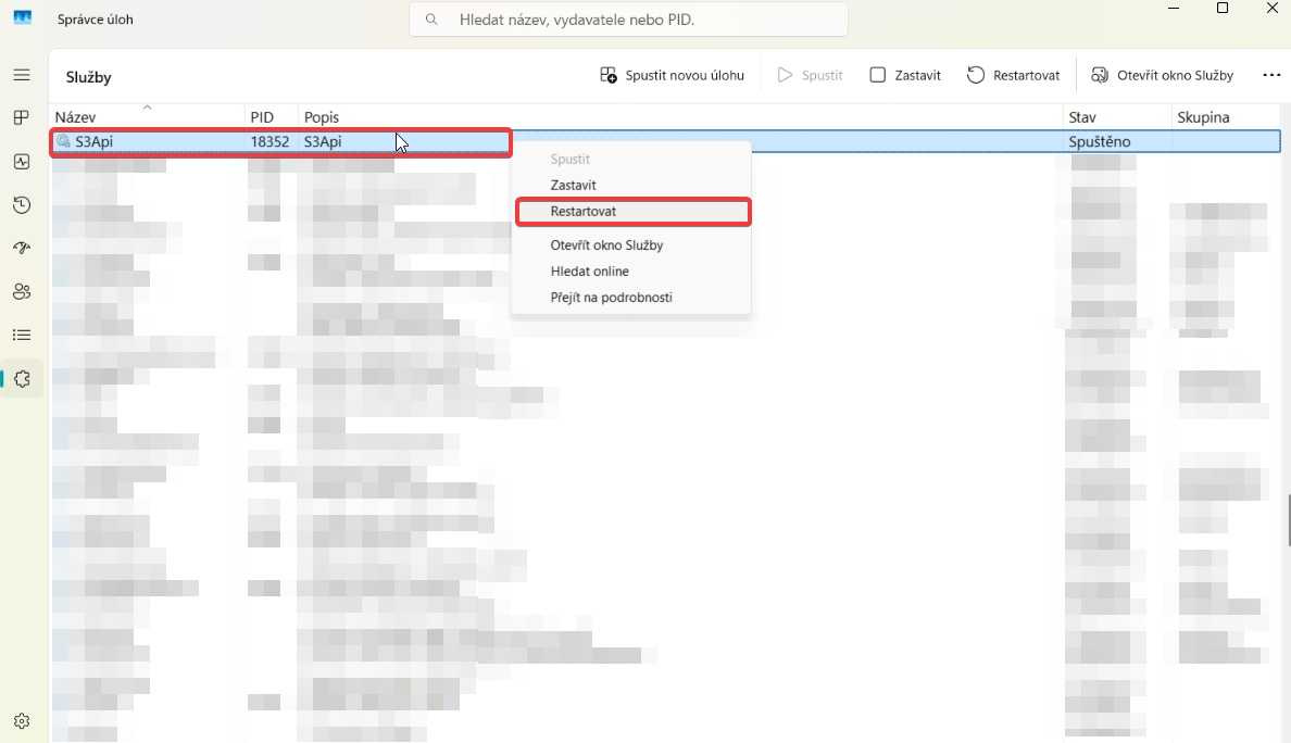 • Na službu S3Api kliknete pravým tlačítkem myši – Restartovat.