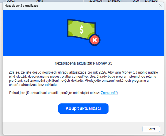 Money S3 obsahuje funkci, která upozorní uživatele, aby si zkontrolovali, zda mají zakoupenou a aktivovanou službu Aktualizace pro následující kalendářní rok. První připomenutí se zobrazí na počátku listopadu.