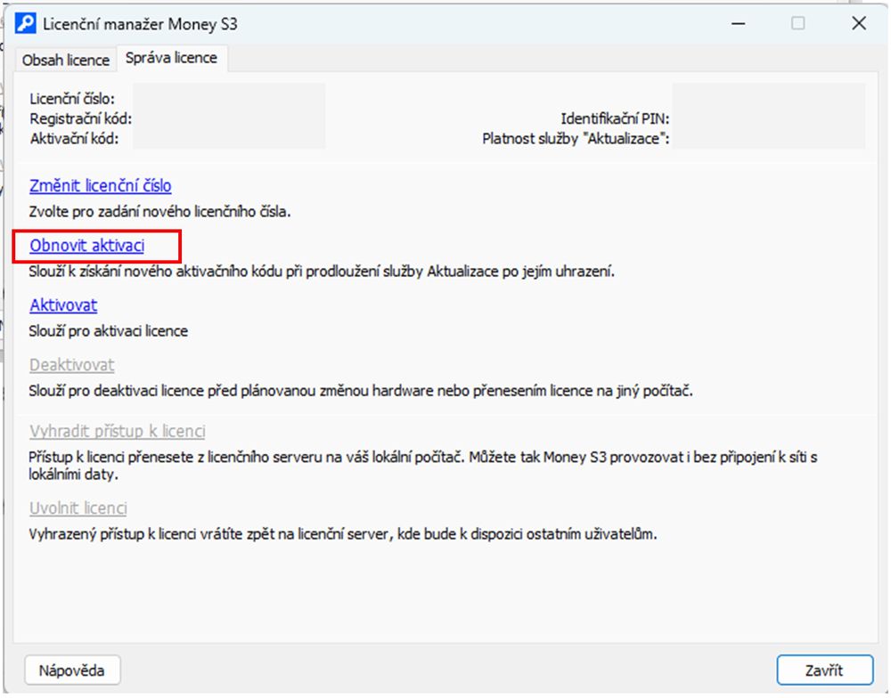 INFO: aktivaci služby Aktualizace umíte provést i manuálně v Money S3. Postupujte přes tlačítko na horní liště Money / Pomoc, kontakty / Licenční manažer, záložka Správa licence a tlačítko Obnovit aktivaci. Výsledkem by měla být změna data platnosti služby vpravo nahoře.