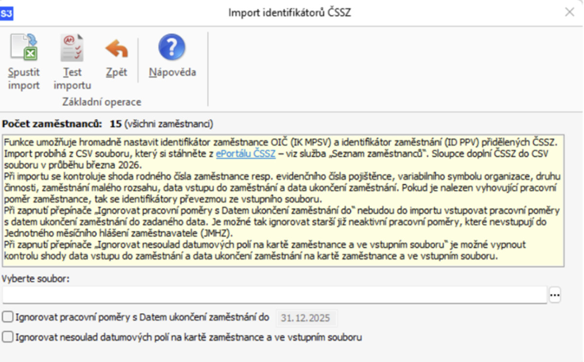 Na Seznamu zaměstnanců je nová volba „Import identifikátorů“, prostřednictvím kterého se hromadně naimportují nové údaje na karty zaměstnanců. Soubor pro import bude možné stáhnout z Portálu ČSSZ - viz služba Seznam zaměstnanců | ePortál ČSSZ v průběhu března 2026.