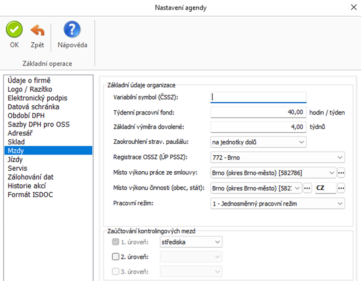 V nastavení agendy v oddílu Mzdy je možné zvolit přednastavení, které se doplní při vytvoření nového zaměstnance. Přednastavit lze: Místo výkonu práce ze smlouvy a Pracovní režim.