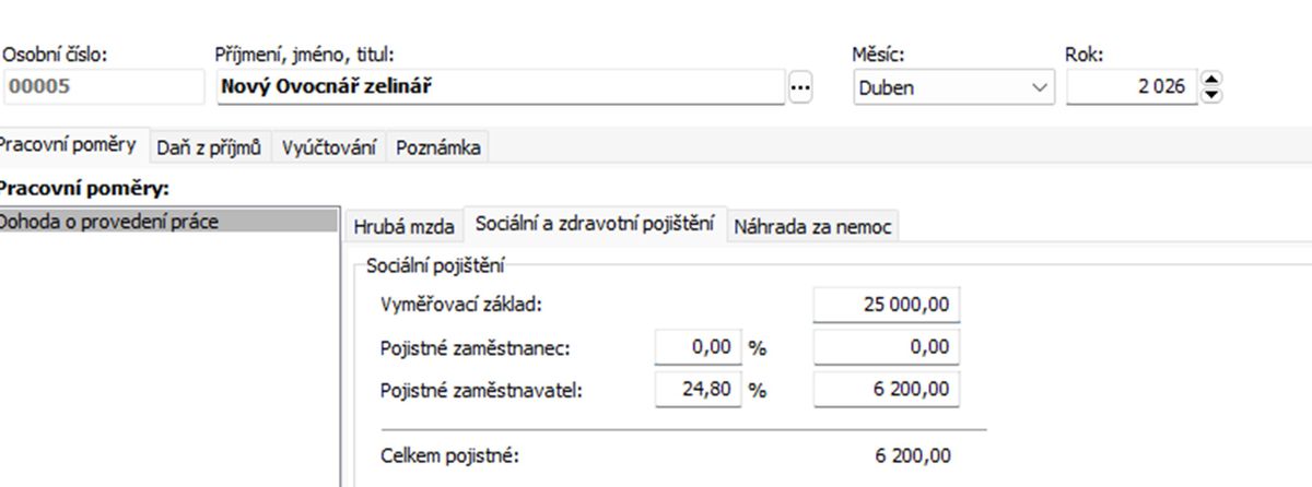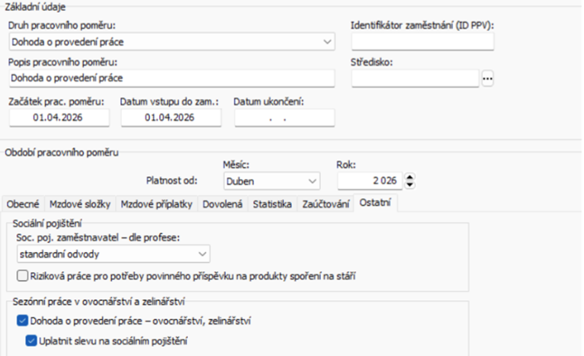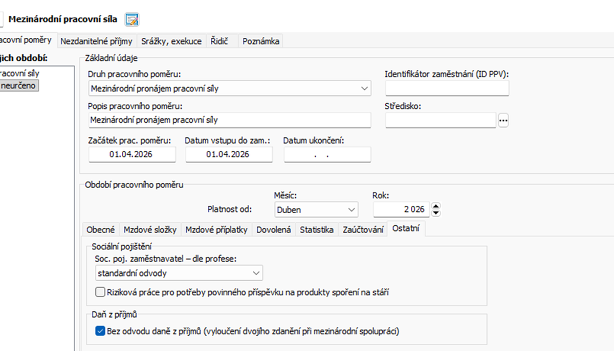 Na kartě zaměstnance, záložka Pracovní poměry, vzniklo nové pole Identifikátor zaměstnání (ID PPV) - Jedná se o identifikátor pracovněprávního vztahu zaměstnance přidělený ČSSZ. Váže se na OIČ a Variabilní symbol zaměstnavatele. Změna RČ / VS nebo OIČ bude vždy automaticky znamenat nový identifikátor ID PPV. Údaj bude možné vyplnit až od března resp. dubna roku 2026.