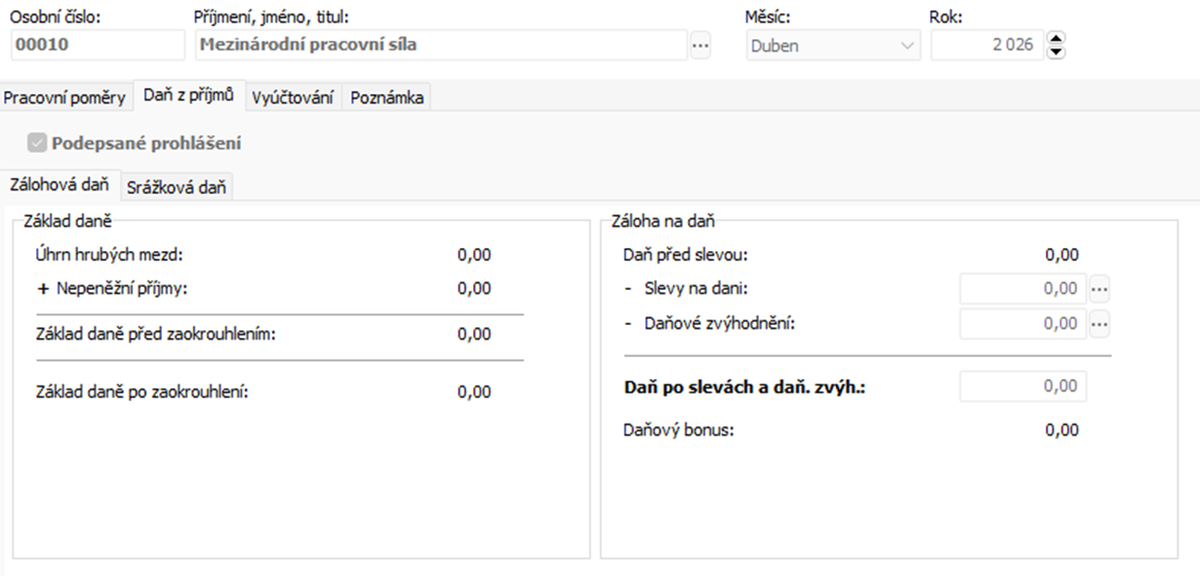 Karta mzdy / Daň z příjmu / neodvádí se žádná daň: