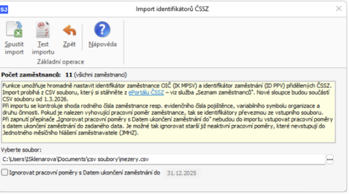 Od 1.3.2026 se na portále ČSSZ (odkaz uveden v MS3 na kartě Importu identifikátoru ČSSZ) vygeneruje csv soubor, který je možný naimportovat do MS3