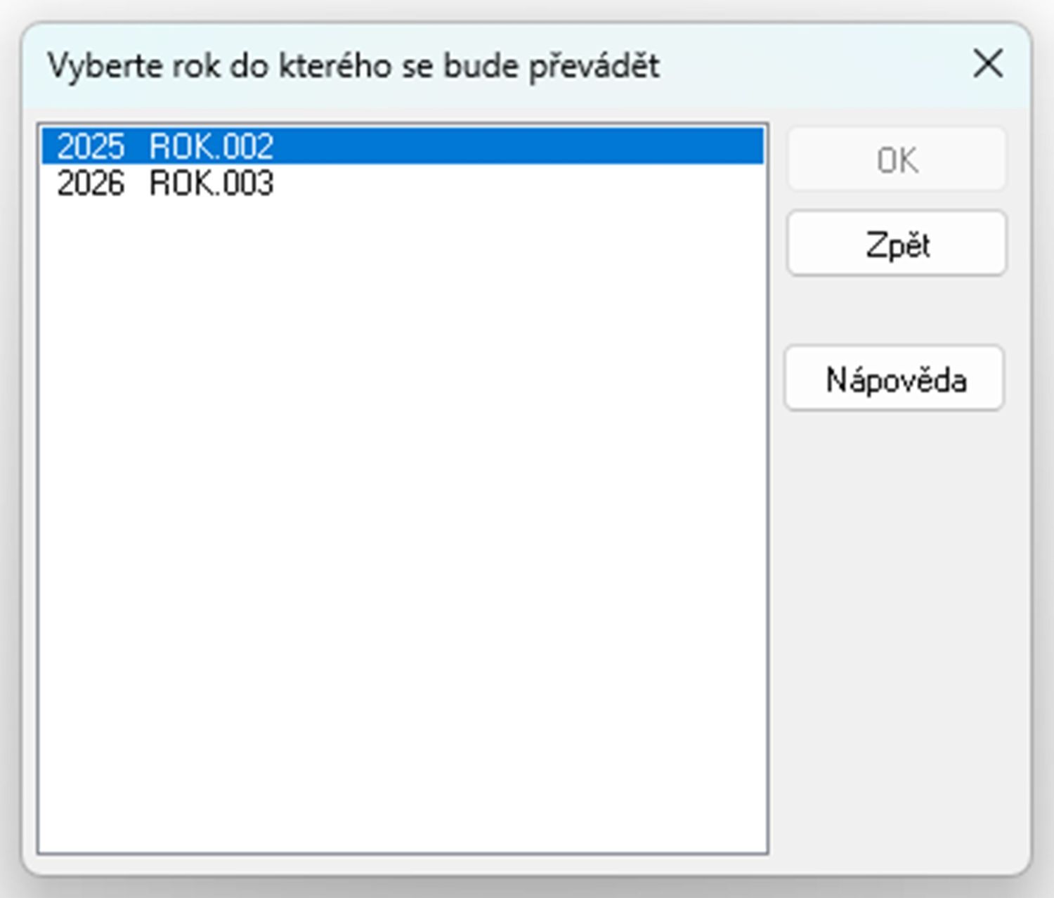 - Musíte mít vytvořený Nový účetní rok. Přejděte do minulého období a volbou Účetnictví / Závěrkové operace / Převod počátečních stavů do nového roku navedete zůstatky do zvoleného roku.
