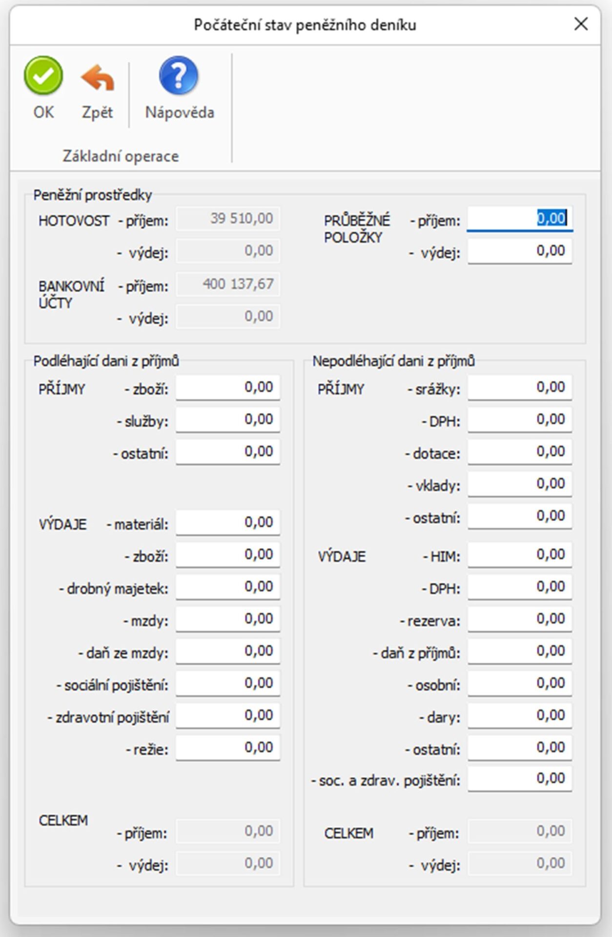 - Na kartě Účetnictví / Závěrkové operace zvolíte Počáteční stav peněžního deníku. Zde můžete zadat počáteční stav na průběžných položkách a v jednotlivých sloupcích příjmů a výdajů. Počáteční stav hotovosti a na bank. účtu se sem přenáší z nastavení na Kartách bankovních účtů a pokladen.