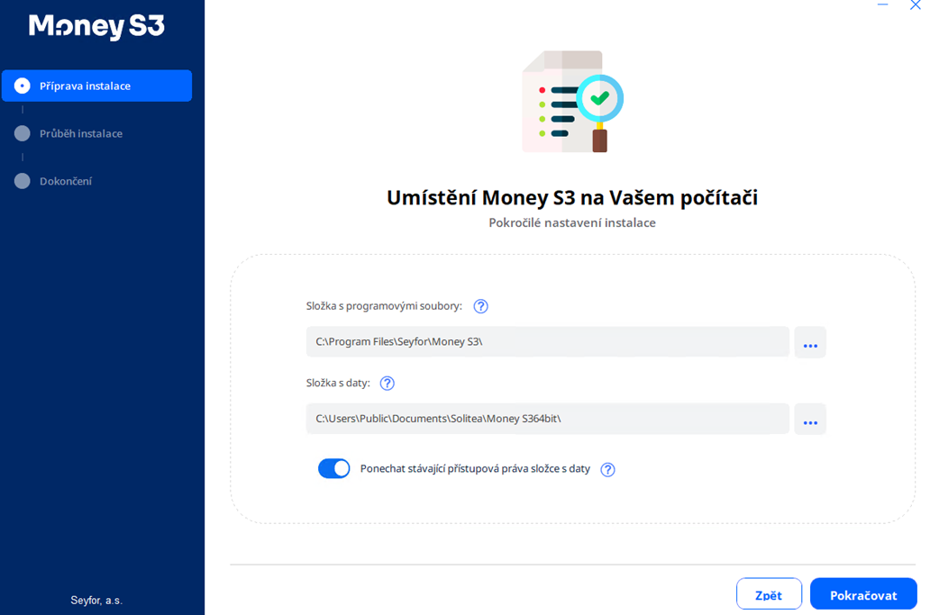 Pokud se rozhodnete pro instalaci Money S3 64-bit nad stejnými daty, není nutné nic měnit v rámci instalace Money S3. Stáhnete tedy kompletní instalační balíček Money S3 64-bit a spustíte jej.