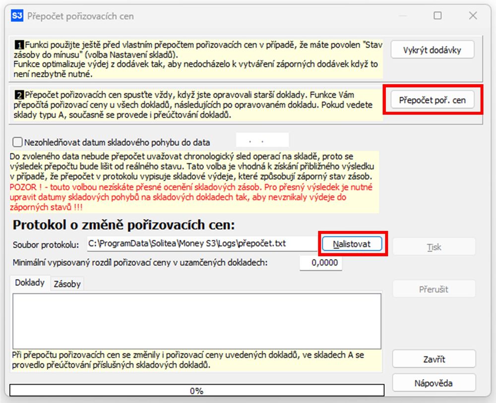 Přepočet hodnoty skladu provedete přes kartu Sklad / Hromadné operace / Přepočet pořizovacích cen (pro všechny zásoby na všech skladech). Otevře se Vám okno Přepočet pořizovacích cen, kde volbou Nalistovat provedete uložení souboru pro budoucí protokol o přepočtu. Volbou Přepočet pořizovacích cen spustíte samotný přepočet, který projde všechny výdajové doklady a provede kontrolu pořizovacích cen vůči samotným příjmům, z kterých doklad čerpá.