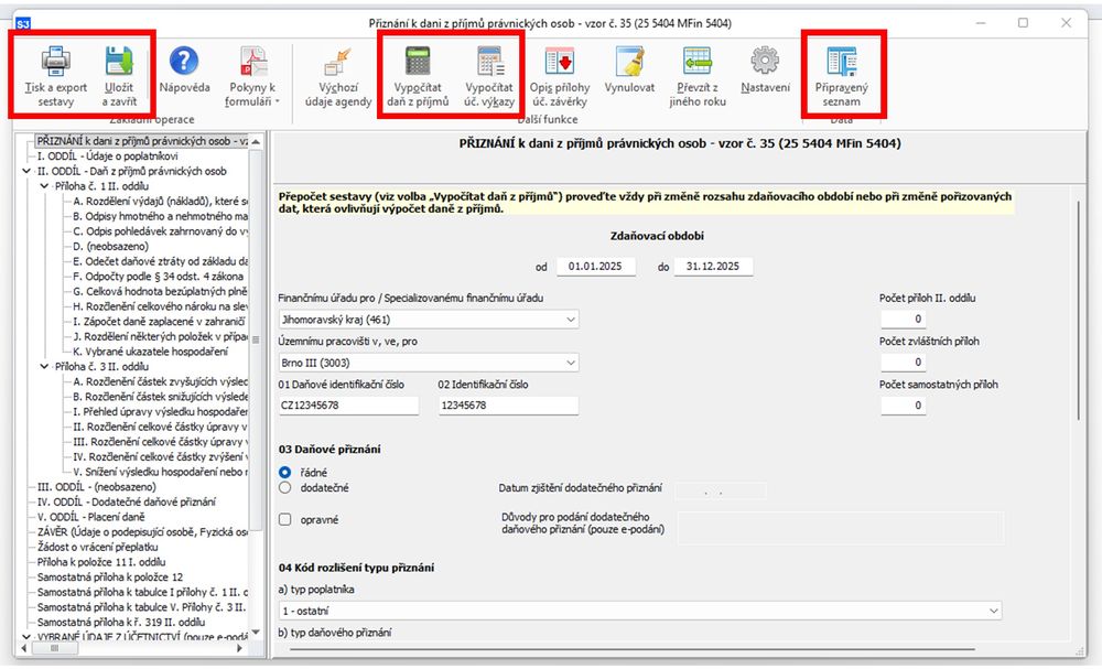 Otevře se vám samotné okno pro vyplnění Přiznání k dani z příjmu. Volba Připravený seznam natáhne aktuální definici, volba Vypočítat daň z příjmu doplní údaje z Money S3. Postupně procházíte možnosti v levé části a doplňujete, případně upravujete jednotlivé hodnoty. Pokud chcete v přiznání pokračovat později, je možné volbou Uložit a zavřít. Volbou Tisk a export sestavy můžete vyexportovat / vytisknout dané přiznání k dani z příjmu.