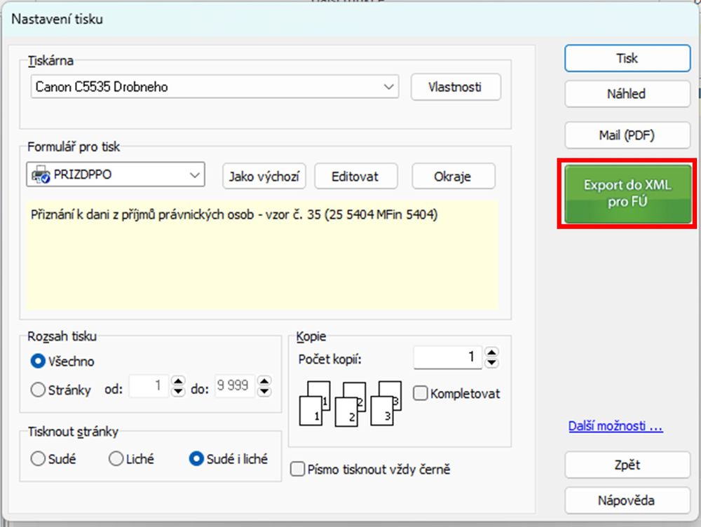V okně Nastavení tisku sestavu vyexportujete pomocí zeleného tlačítka Export do XML pro FÚ.