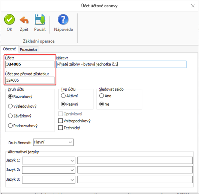 - Upravte číslo účtu (např. 324.005) a doplňte Název (např. bytová jednotka č.5)