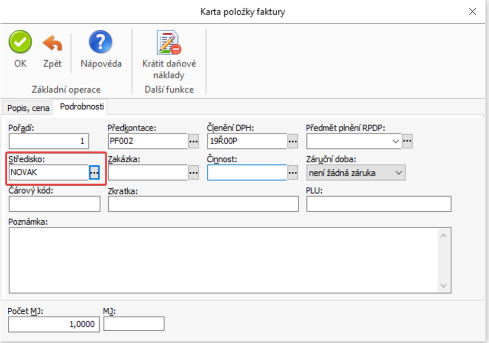 Každému dokladu je možné přiřadit středisko, a to stejné platí i pro jednotlivé položky, které na dokladu jsou vytvořené. Středisko na doklad přiřadíte pomocí tří teček o pole Středisko. U položky dokladu přiřadíte středisko na záložce podrobnosti.