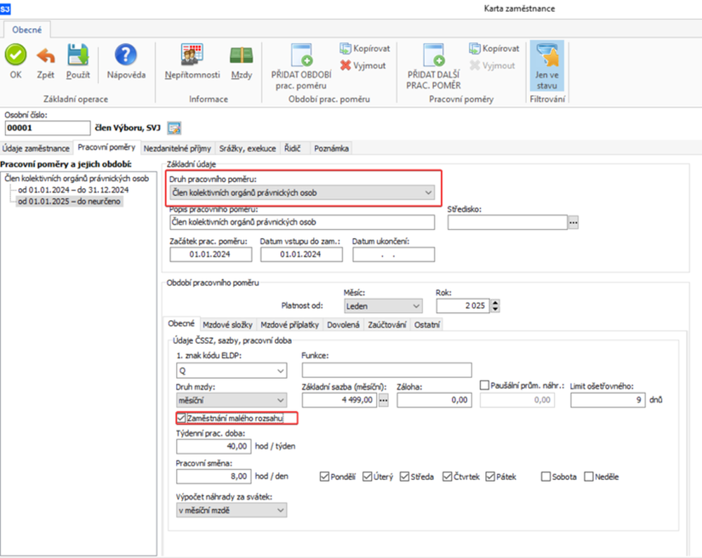 Pro evidenci zaměstnance jako člena kolektivního orgánu půjdete přes záložku Režie -> Zaměstnanci -> Kliknete na tlačítko Přidat -> na záložce údaje zaměstnance nastavíte období a na záložce pracovní poměry nastavíte druh pracovního poměru – člen kolektivních orgánů právnických osob.