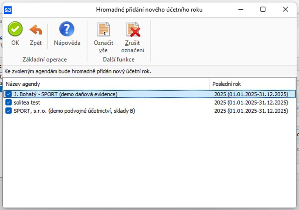 Zvolte možnost Přidat rok hromadně. Tímto spustíte průvodce Hromadné přidání účetního roku, kde se pro agendy, které jsou zakliknuty, vytvoří nový účetní rok (POZOR – vždy se přidá rok následující, takže pokud je v agendě poslední rok 2025, přidá se rok 2026, pokud již existuje rok 2026, přidá se rok 2027). Pokud pro nějakou agendu nový rok přidat nechcete, stačí zakliknutí zrušit. Generování nových let spustíte tlačítkem OK.