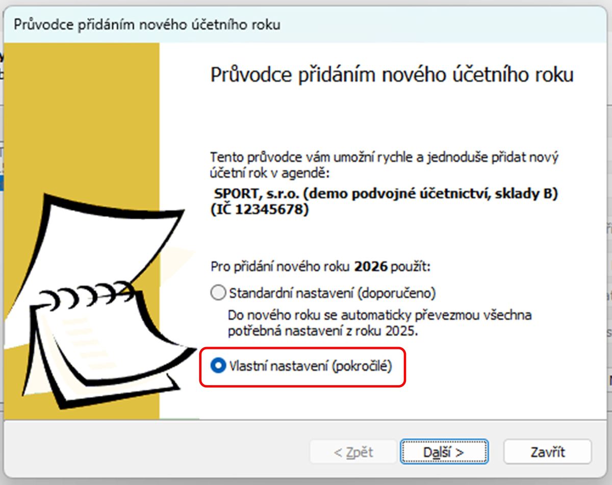 a) V případě, že jste zvolili Vlastní nastavení, provede Vás založením nového roku průvodce. Pokud jste zvolili Standardní nastavení, můžete tento bod přeskočit.