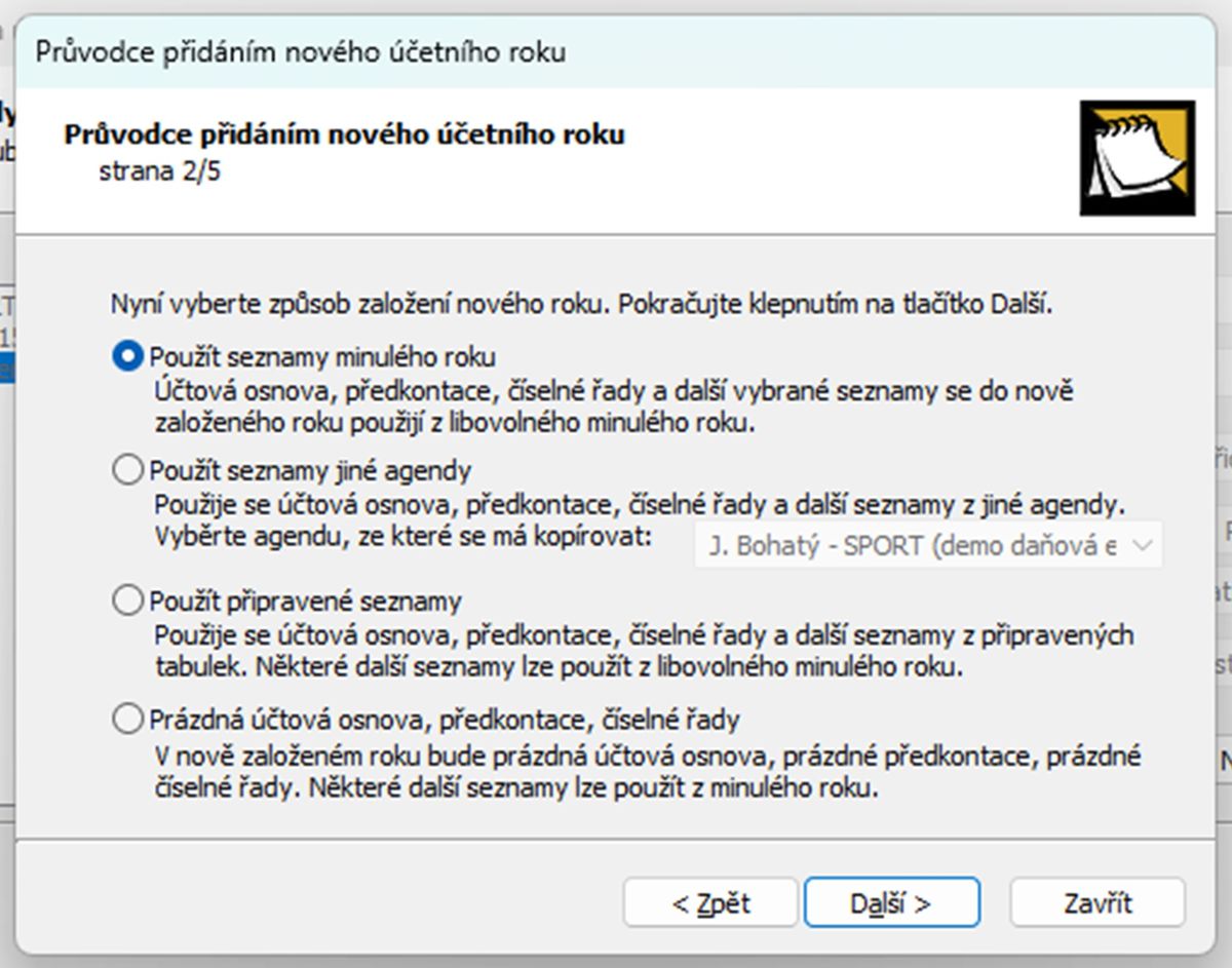 II. Vyberte, odkud se mají převzít seznamy pro nový účetní rok (účtová osnova, předkontace apod.). Doporučujeme Použít seznamy minulého roku, čímž budou seznamy naplněny stejnými údaji jako v roce 2025 a v roce 2026 si je můžete v případě potřeby upravit.