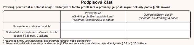 Zde nejprve vyplňte rok zdaňovacího období. Nejde-li o dodatečné prohlášení, nechejte kolonku za „dodatečně činím“ prázdnou. Podepisujete-li dodatečně, vyplňte do ní „XD“.