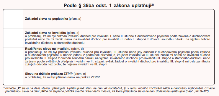 - Osoby samostatné výdělečně činné, které jsou zároveň zaměstnanci, mohou u svého zaměstnavatele prohlášení podepsat, aby uplatnili daňové slevy každý měsíc (a ne až s podáním daňového přiznání). Nesmí ale u zaměstnavatele podepsat roční zúčtování daně, pokud jejich příjmy z podnikání v uplynulém roce přesáhly 6 000 Kč. Místo toho podávají daňové přiznání.