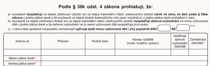 Do bílých řádků vypíše zaměstnanec údaje o svých dětech. Pokud zaměstnanec na dítě zvýhodnění neuplatňuje, napíše do kolonky „Uplatňuji/neuplatňuji” slovo neuplatňuji. Děti, za které zvýhodnění uplatňuje pak označí číselně 1/2/3. Ze zákona je totiž vyšší sleva za každé další dítě, na které zaměstnanec zvýhodnění uplatňuje.